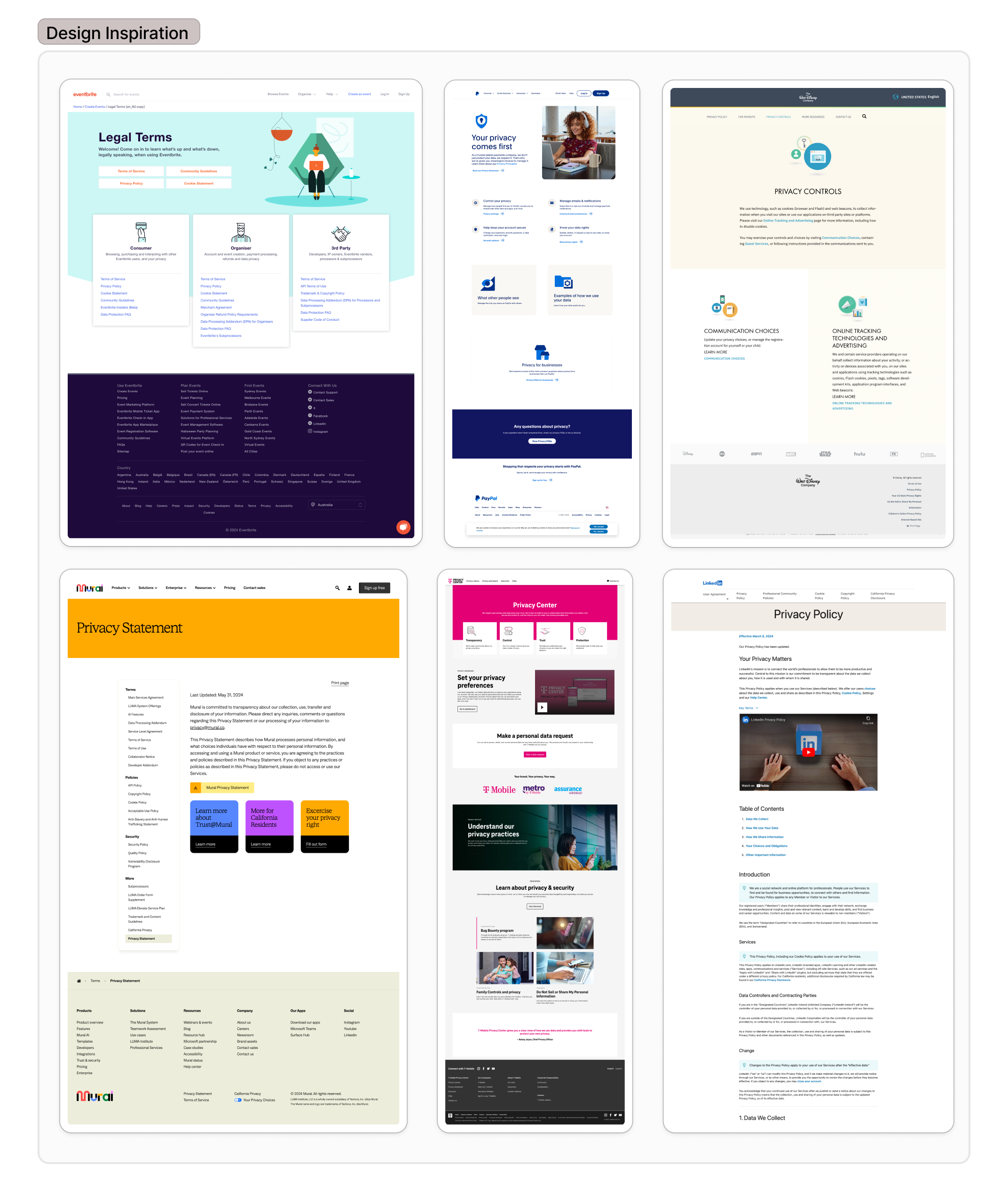 To base our design on up to date tendencies, I conducted a competitive analysis of companies known for strong privacy experiences, including Disney and T-Mobile. My goal was to understand how large organizations compartmentalized legal documentation in a way that felt user-friendly.