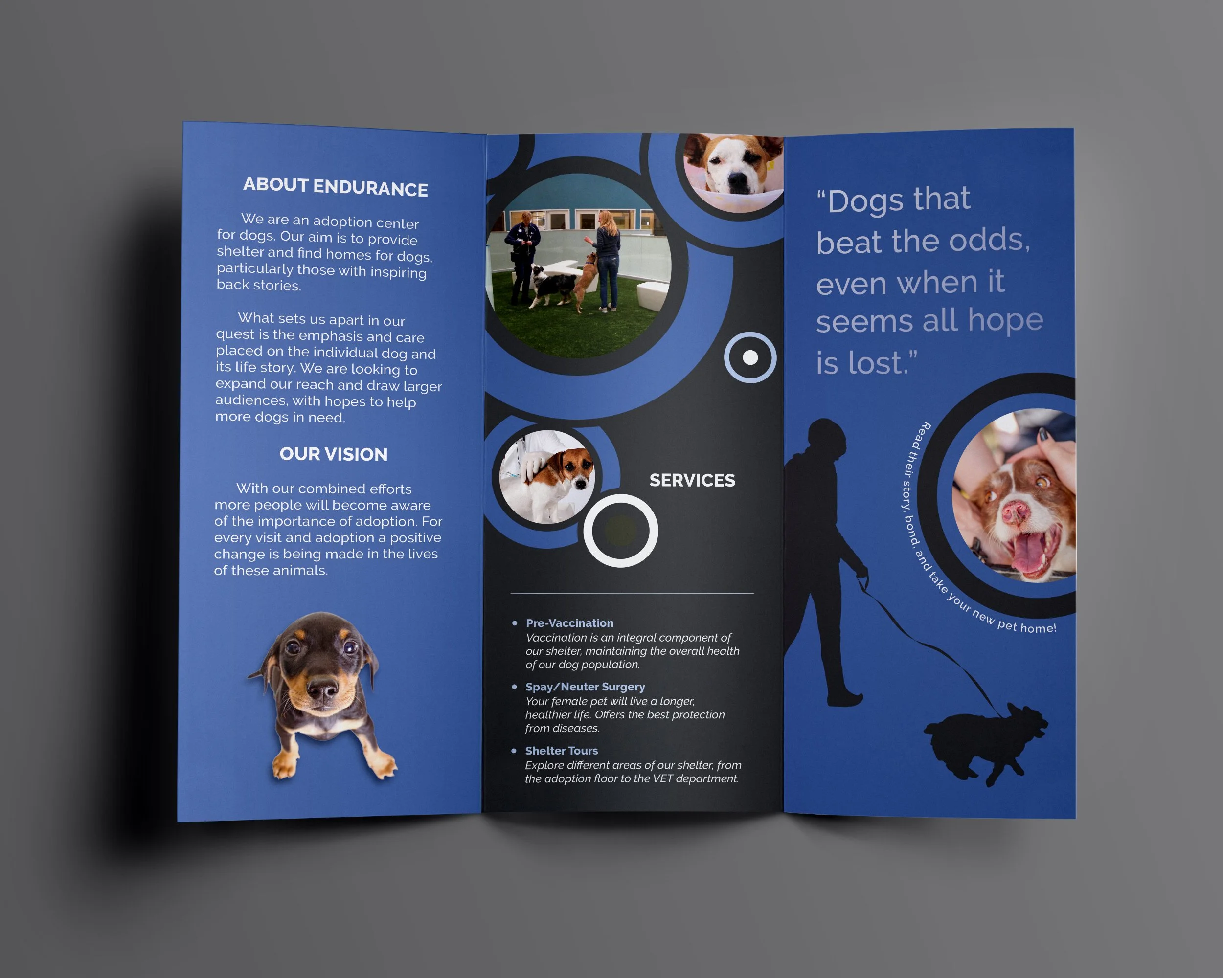 Endurance is a dog adoption center dedicated to providing shelter and finding homes for dogs, particularly those that have experienced hardship. This project was developed as part of my undergraduate senior thesis, emphasizing the unique stories and resilience of each dog. My role was to art direct and design a comprehensive visual identity that highlights the l inspiring journeys of these dogs.