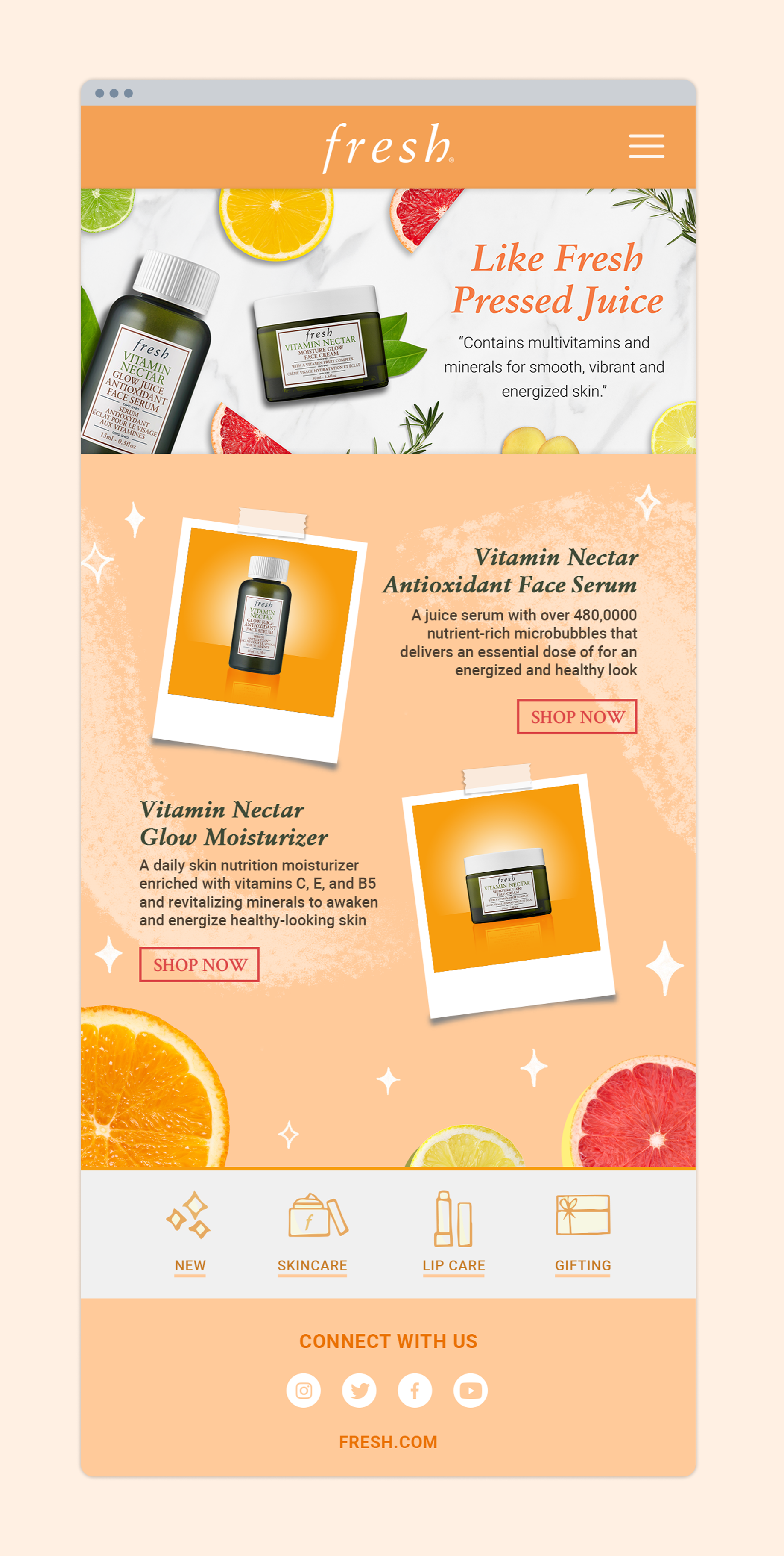 Fresh is a skincare brand that combines natural ingredients with modern science to create effective formulas. As a designer on this project, I developed campaign assets for the Vitamin Nectar line, focusing on vibrant product styling, and advanced photo retouching. This approach aimed to reflect the brand’s commitment to natural, green products while appealing to a modern skincare audience.